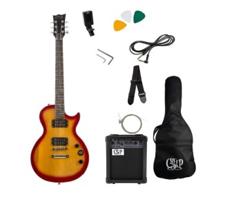 La guitarra incluida presenta cuerpo tipo Les Paul, con acabado Wine Red brillante, entregando una estética clásica y...