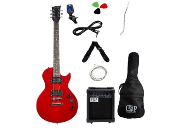 La guitarra incluida presenta cuerpo tipo Les Paul, con acabado Wine Red brillante, entregando una estética clásica y elegante. Su cuerpo de aliso proporciona buen balance tonal, mientras que el mástil y diapasón de arce ofrecen comodidad y estabilidad, facilitando el aprendizaje y la ejecución de acordes y solos.
