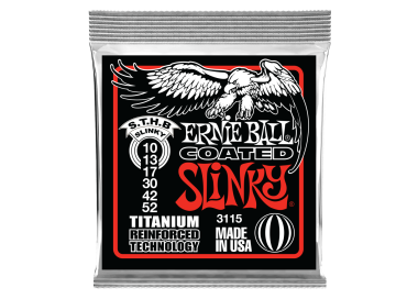 Set de cuerdas Ernie Ball 3115 Coated Skinny Top Heavy Bottom para guitarra eléctrica, calibre 10–52. Fabricadas en acero niquelado con recubrimiento protector, ofrecen un tono brillante, definido y balanceado, con mayor durabilidad y resistencia a la corrosión. La combinación Skinny Top y Heavy Bottom proporciona comodidad en las cuerdas agudas y potencia en las graves, ideal para bendings, riffs y solos complejos, manteniendo afinación estable y tacto profesional.