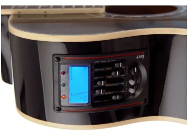Incorpora el EQ LC-5 de 5 bandas, que permite ajustar graves, medios y agudos según el entorno o amplificación utilizada. Además, incluye afinador cromático integrado y control de volumen, facilitando ajustes rápidos sin accesorios adicionales.