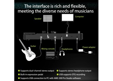 El AUDOTA AME-200 Pro integra un sistema completo de modelado digital que permite emular amplificadores, gabinetes y efectos profesionales en un solo dispositivo compacto.